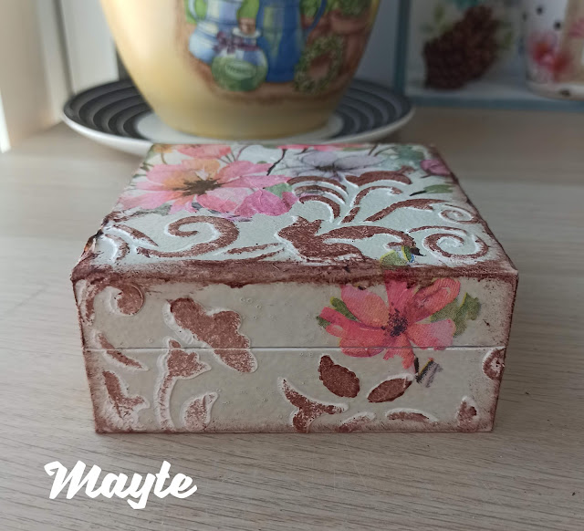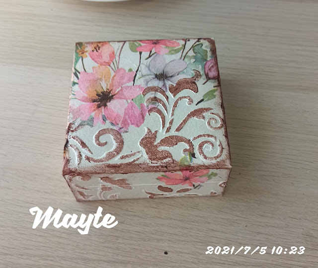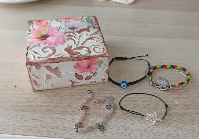 Una de ellas llevaba una de carton que se abría, asi que la he decorado para guardar las pulseras cuando llegue el invierno.