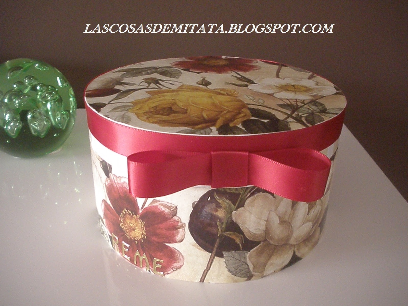 Esta linda Caja Cilíndrica decorada en Decoupage ha sido un encargo de Jenny para regalarsela a su amiga Reme. La verdad que esta combinación de colores a mi me encanta, la suelo utilizar mucho y es que las rayas en beig, las flores y el lazo en burdeos queda que ni pintada!