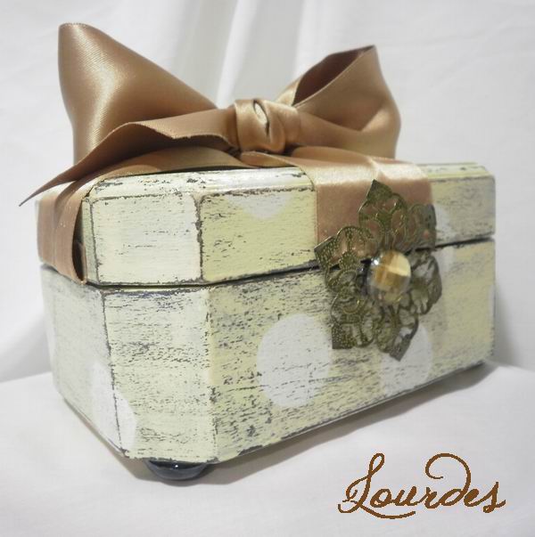 Le he sustituido su cierre original por un enorme adorno metálico con una piedra de cristal a juego con el enorme lazo de raso que lleva en la tapa En el fondo le he colocado piedras en negro que hacen su veces de patitas, de este pequeño cofre de tesoros Como veis el exterior está combinado con enormes lunares blancos también decapados