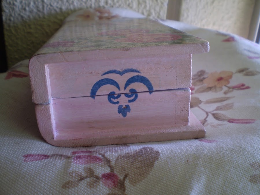 Una vez preparada, utilicé el pincel duro y apliqué la pátina de color rosa ( la técnica es la misma que cuando os expliqué el porta cartas) En la tapa no le puse,puesto que la iba a tapar con la lámina.