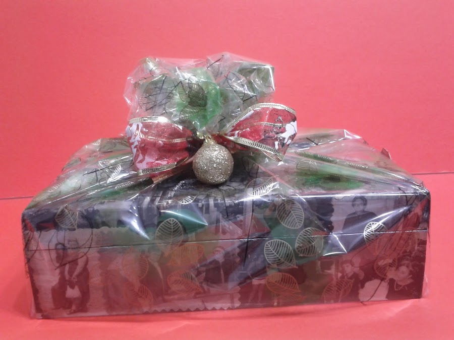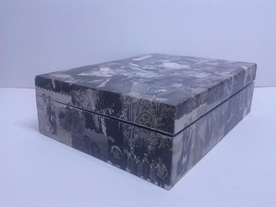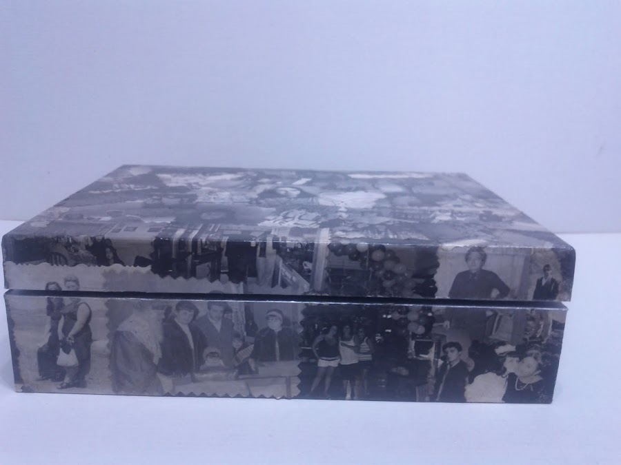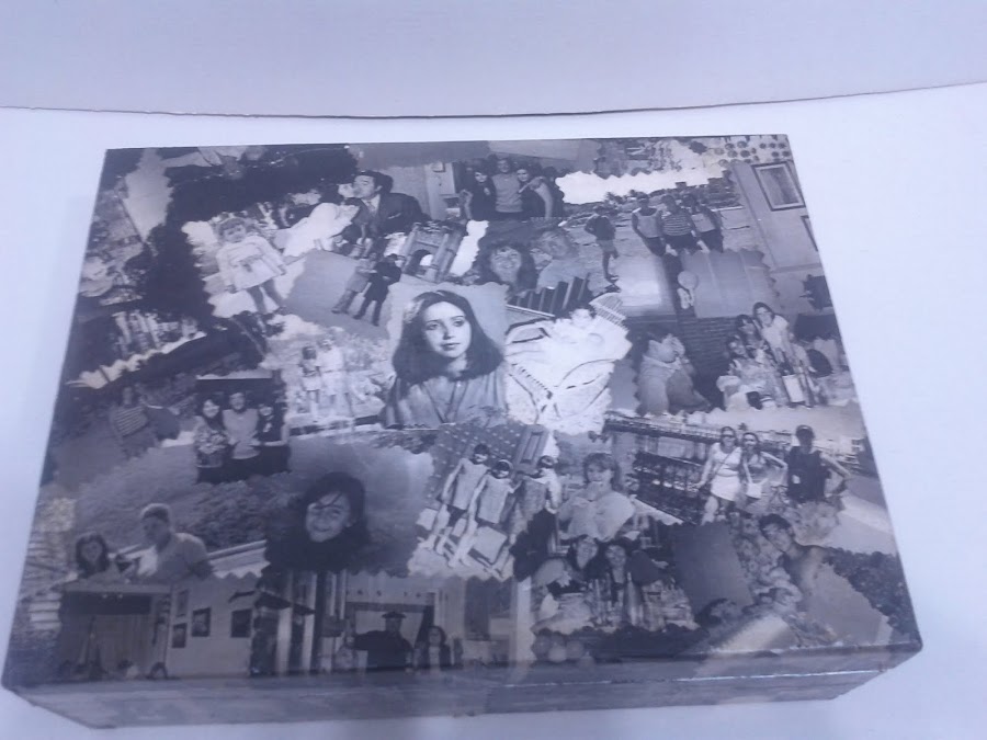 Caja de madera forrada con fotografias y pintada con acrilicos