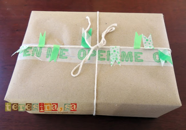Envuelta con papel craft y unas banderitas hechas con washi tape de Ikea.