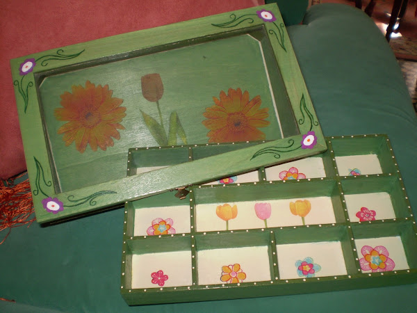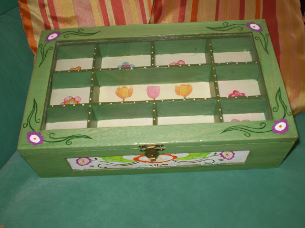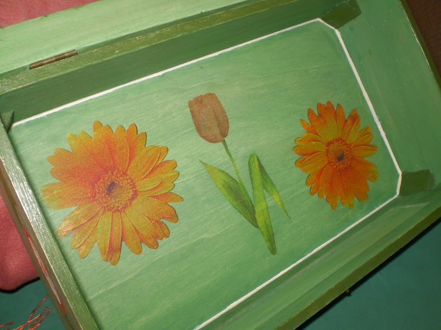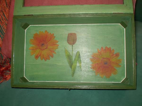Os recuerdo que cuando se hace decoupage con servilletas, si el fondo no es claro, se transparente el color a través de la servilleta y los motivos pierden color y nitidez, pero en este caso al teñir la madera de un verde suavee y los motivos son de colores vivos, apenas perdieron nitidez y conservaron los colores.