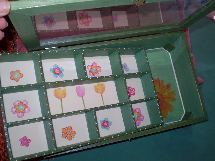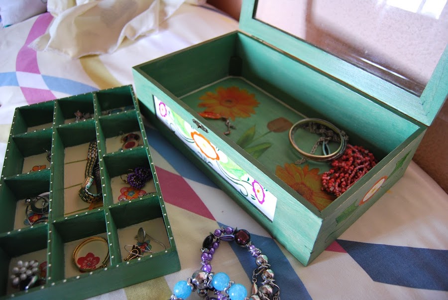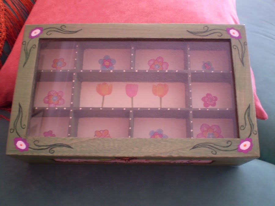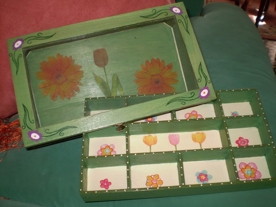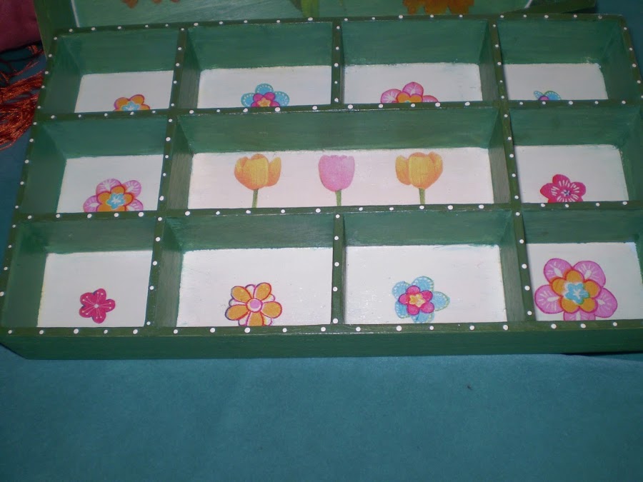 La caja lleva un cajoncito dividido en compartimentos, que adorne con recortes de servilletas