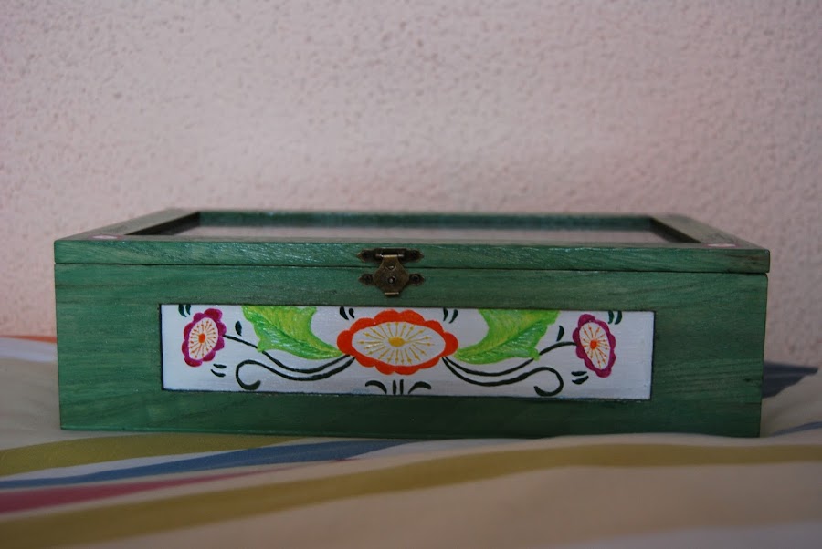 La parte de delante de la caja, viene con unos relieves, que pinté también con acrílicas e hice una composición para las esquinas de la caja y para los laterales, del mismo estilo.