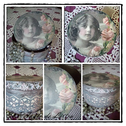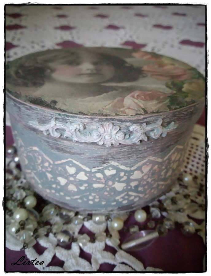 Mi caja lleva un stencil en relieve, que lije para crear imperfecciones, también decapado y envejecido y un adorno que realicé con pasta y molde de silicona pintado y decapado.