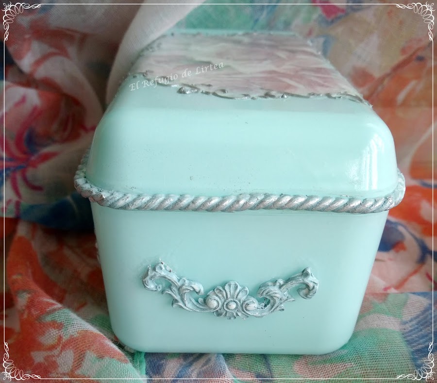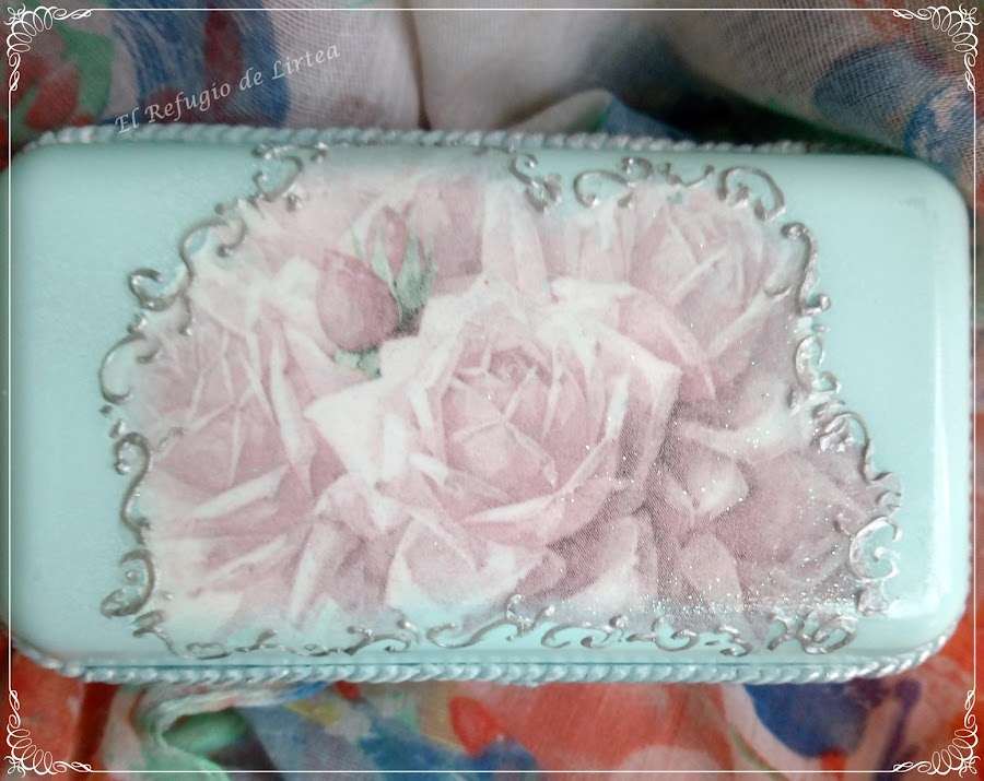 En la tapa, hice un decoupage con servilleta y unos adornos rodeando la imagen con pintura en 3D en color plata.