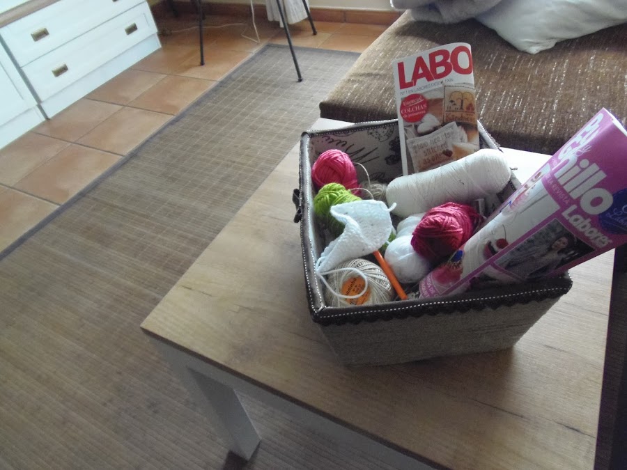 Y ya la tenemos lista para albergar las lanas al lado del sofá,yo le he puesto unos remates de puntilla,que creo que quitaré porque no me acaban de convencer,pero bueno el cambio es evidente