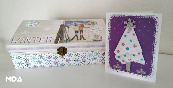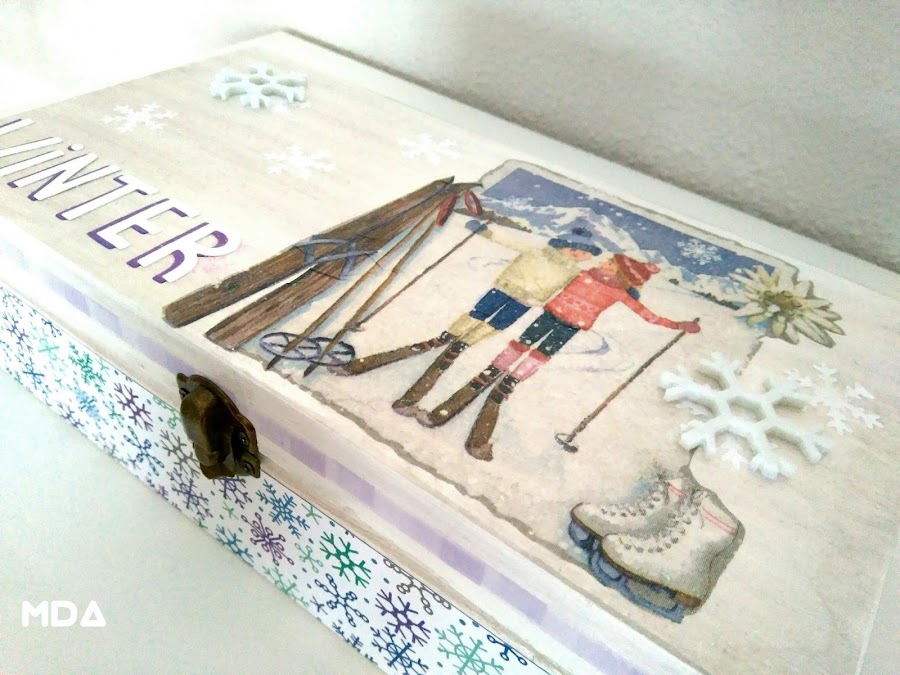La caja de madera la he pintado con chalk paint blanca y forrado la parte inferior con un papel navideño de Simple Stories, una washi tape en degradado lila y una imagen invernal para la tapa como decoración principal.