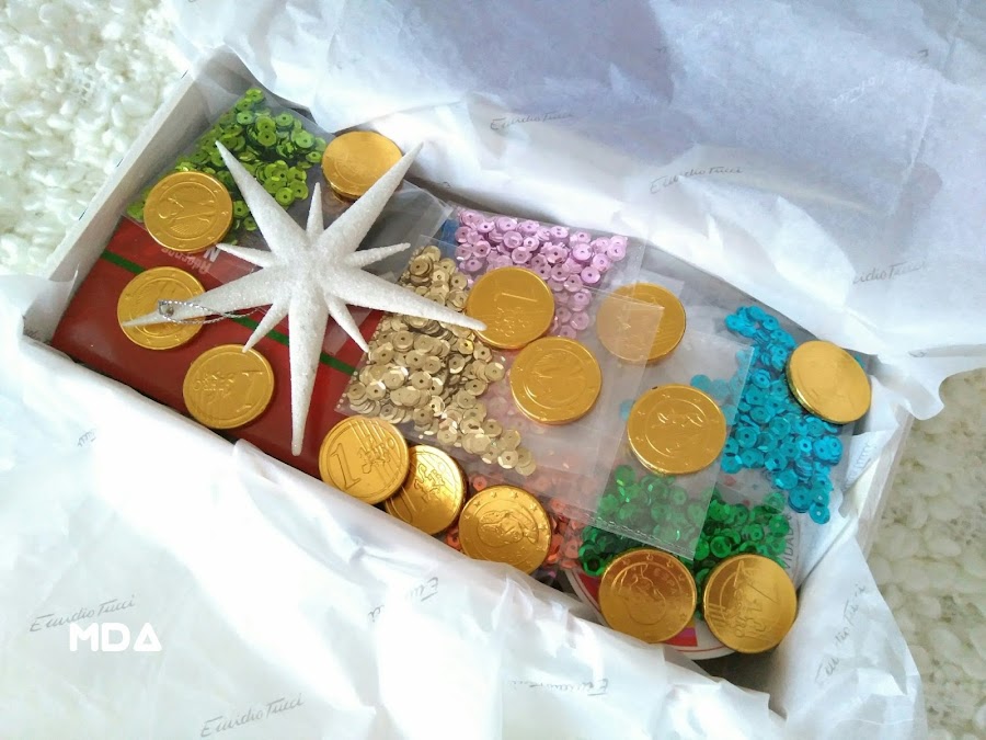 Dentro de la caja y como si fuera un cofre del tesoro los regalitos scrapperos entre otros.