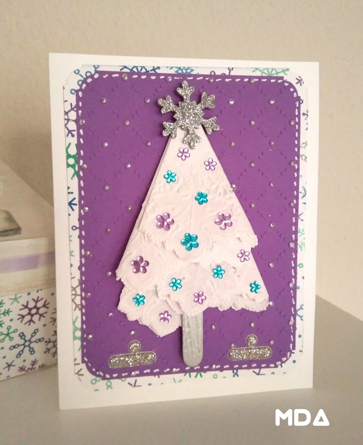 El árbol de Navidad está hecho con una blonda plegada entorno a un palo de helado pintado con una de las pinturas en spray de CarrotCake by Vallejo de color plata.