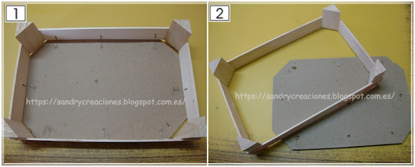Paso 6. Pegar la base a la caja. Una vez decorada la base, recuperamos la estructura de la caja y pegamos la base a ella con cola blanca y 4 clavos, uno en cada esquina, para que quede mejor sujeta.