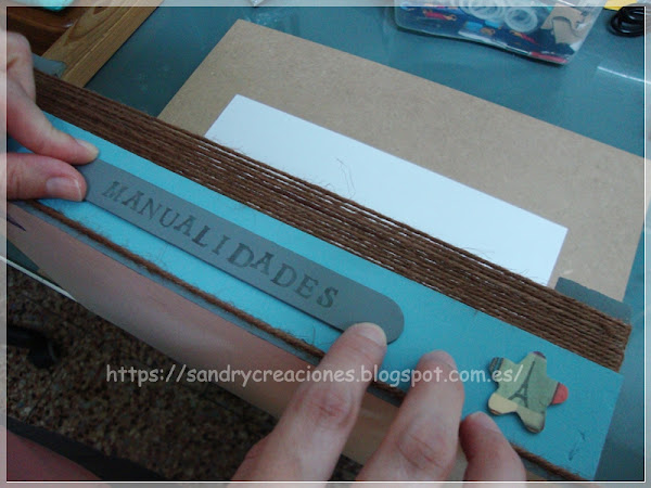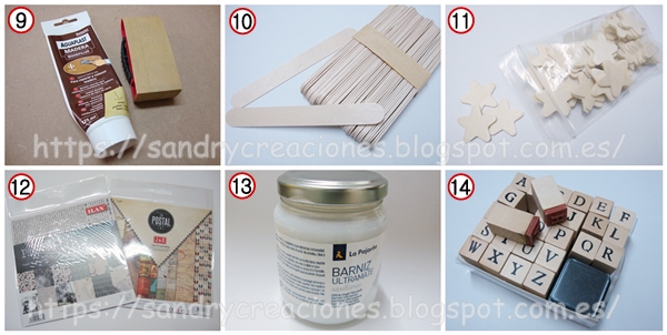Pintamos los palos de helado anchos con pintura chalk paint de color vintage y una vez seca, con ayuda de tampones de letras y tinta negra marcamos los rótulos que queramos, en nuestro caso, uno con "SanDryCreaciones" y el otro con "Manualidades". Una vez seca la tinta barnizamos con barniz ultramate.