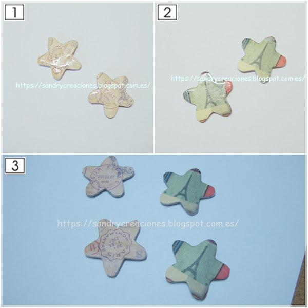 Para las estrellas de madera decoramos cuatro estrellas de madera precortadas con la técnica del decoupage con unos motivos que nos gusten y una vez seco barnizamos con barniz ultramate.