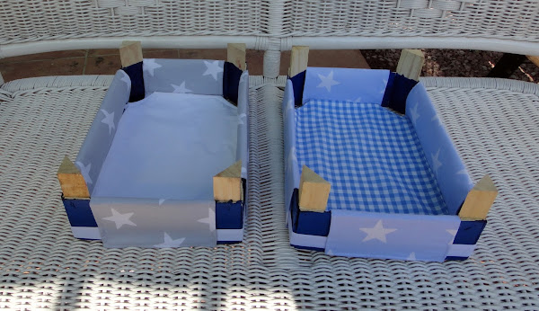 -Telas. Yo he utilizado telas de patchwork. Necesitáis una pieza de 35x25 cm para el fondo de la caja y otra de 45x35 cm para los laterales. Pueden ser iguales o distintas (también os sobrará algo). Aparte de telas de algodón patchwork podéis usar lino, loneta, piqué... lo que os apetezca.