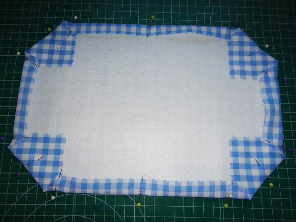 En la pieza del fondo, colocamos el fieltro sobre el revés de la tela. Doblamos las esquinas, sujetando con alfileres, y hacemos lo mismo por todo el borde. Planchamos bien para que quede fijado el doblez.