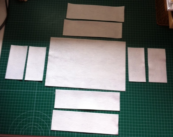 En las telas, tenemos que añadir 4 cm a la medida de los fieltros, para poder hacer bien el dobladillo. Por tanto necesitamos: Un rectángulo de 33x23 cm para el fondo. Para los laterales, dos rectángulos de 27x17 cm y dos cuadrados de 17x17 cm.
