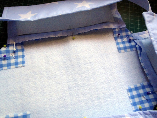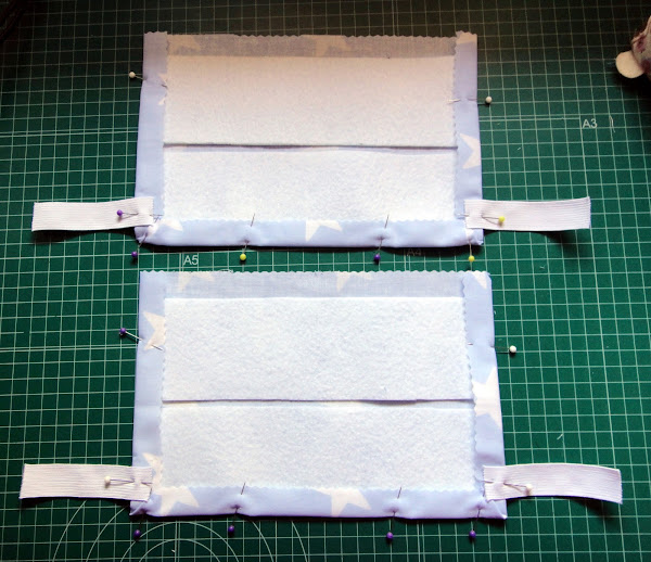 Para los laterales colocamos dos rectángulos de fieltro sobre el revés de cada tela, centrados pero un poco separados. Hacemos dobladillo, sujetando con alfileres, solo tres de los lados. El lado que irá unido al fondo lo dejaremos sin doblar. Planchamos.
