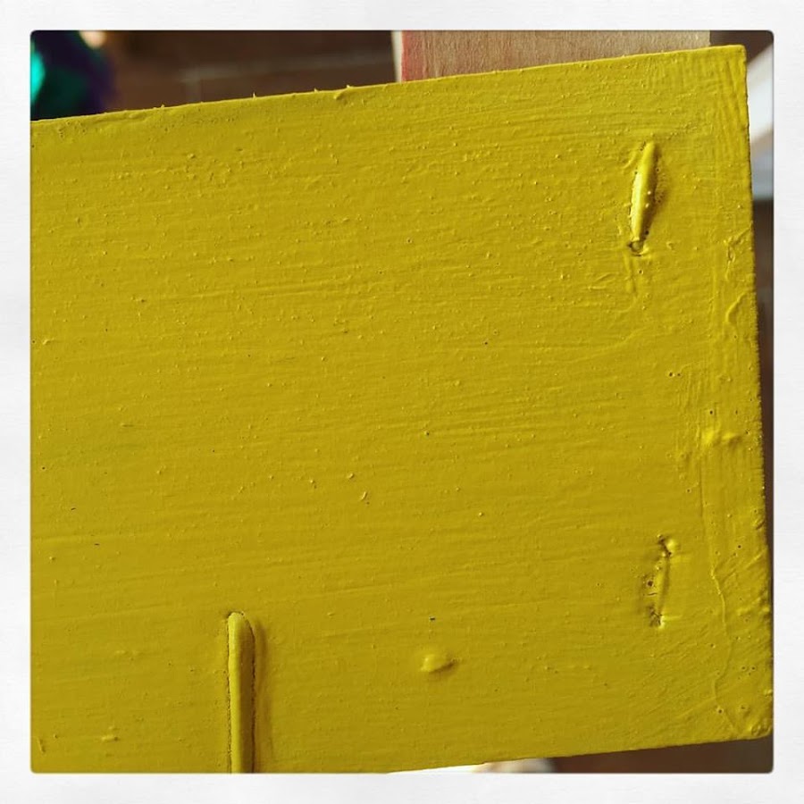 En la primera que hice no conseguí al 100% el efecto mate del chalk paint, pero me gustó el resultado. De esa pintura amarilla, aplicada tal cual, habría necesitado bastantes manos para cubrir por completo las letras que traen las cajas de fresas. Con la mezcla de aguaplast, con un par de manos me quedó bastante aceptable. Dejad pasar un par de horas entre una mano y la siguiente.