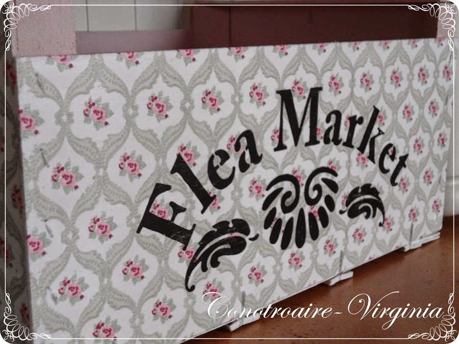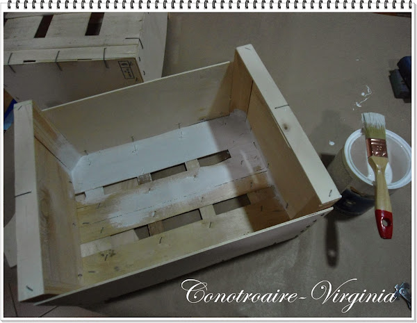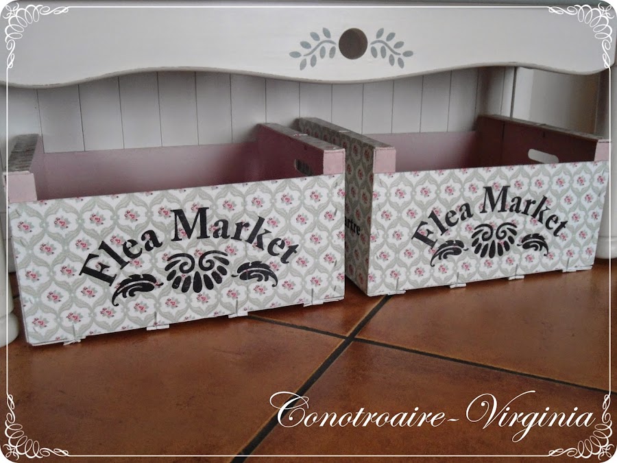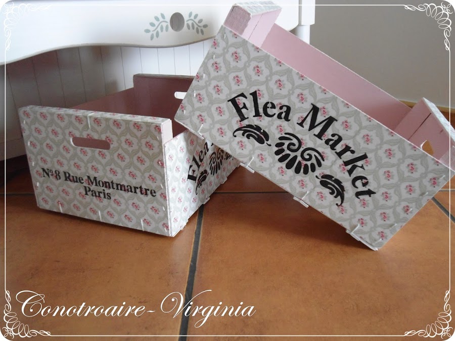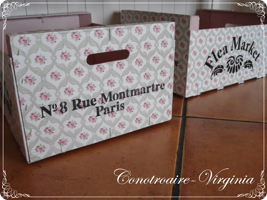 En los frentes y costados de las cajas, he decorado con un stencil que con muchiiiiiiiisima paciencia hice yo misma a medida para las cajas.