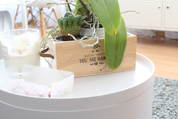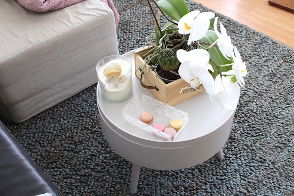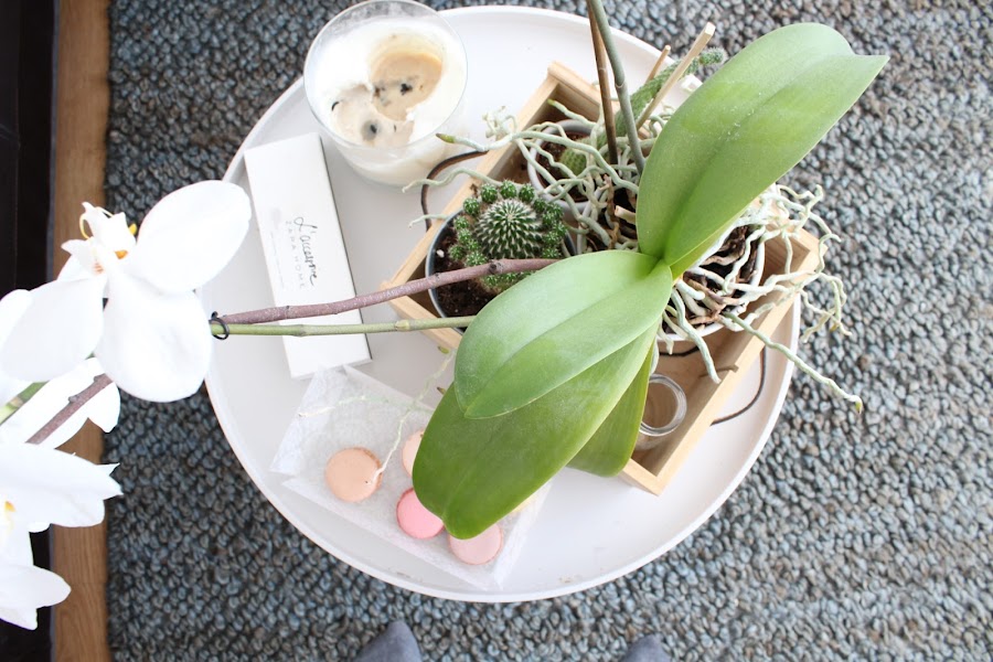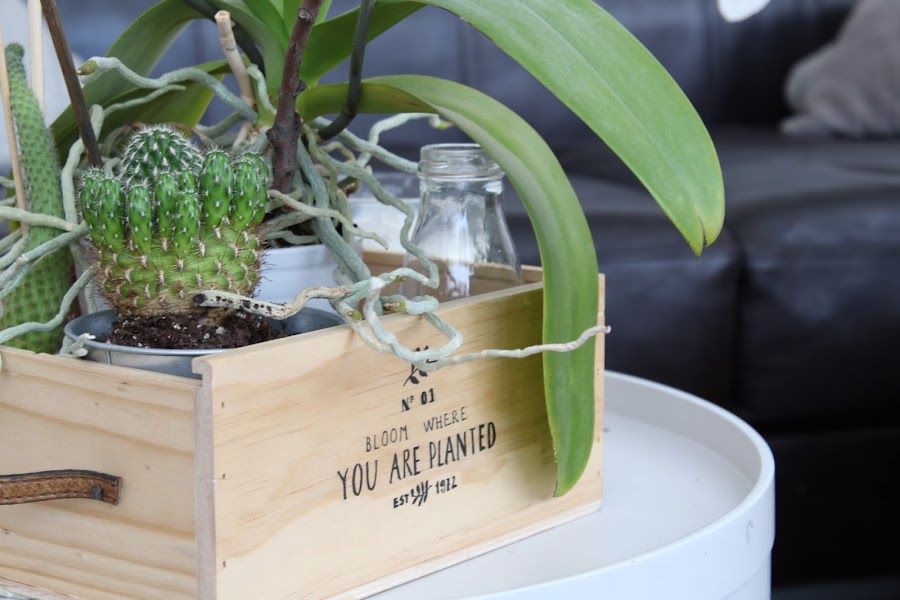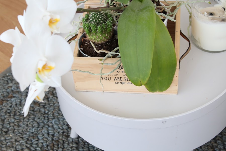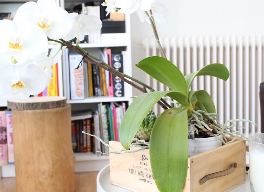 Ahí vive ahora nuestra orquídea que es como nuestro "milagro particular" que rescatamos de un palet de plantas moribundas de Ikea y que no sabemos todavía cómo no solo no se murió como era más que previsible, si no que que además florece cada primavera y nos deja esas flores preciosísimas durante meses; y unos cuantos cactus que compramos emocionados de Desert City y que también florecen de vez en cuando (de verdad, es increíble).