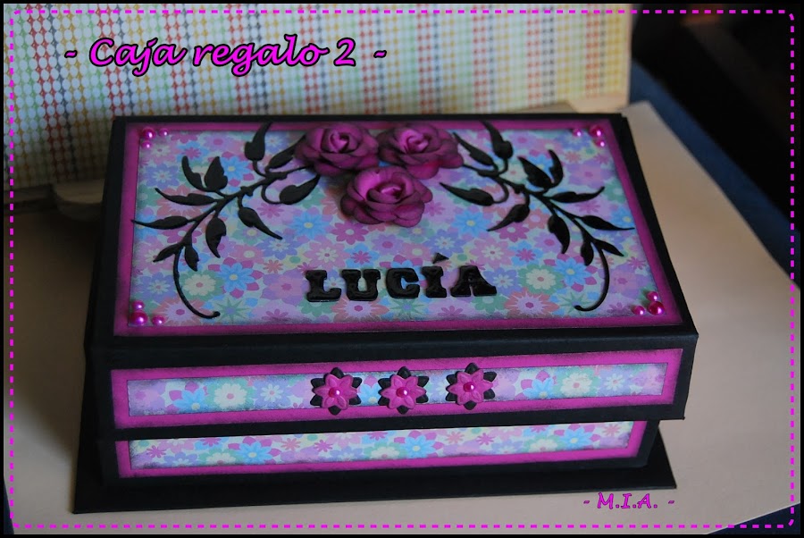 Unos arabescos con Glossy Acent, unas flores caseras, unas perlitas a juego y el nombre de las destinatarias conforman los adornos.
