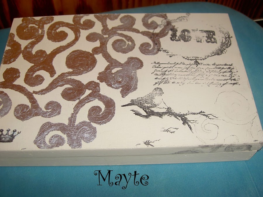 ¿Tienes una caja y no sabes como decorarla? Hoy te enseño unas cuantas que hemos decorado en clase. Las han hecho de todos los estilos Con aluminio... Pintadas a mano.... Con papel de decoupage y pintura.... con plomo, estuco y papeles.... con metal repujado..... con goma eva..... con siluetas de madera.... decapadas.... y muchas mas que os enseñaré en otro momento. Besos
