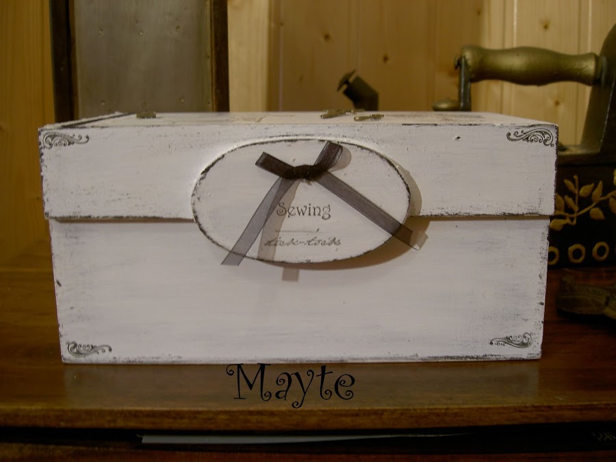 Hoy una entrada cortita para enseñaros un par de cajas de fresas que decoré para poner en mi cuarto. Esta primera la pinté de blanco y con una cinta, un poquito de puntilla, dos pequeñas rosas y un trozo de tela de pizarra... preparada para guardar los botecitos de abalorios, y si un día cambio de idea, con un trapito y una tiza, lista para otro uso. Y esta otra, aunque no se distingue muy bie ...