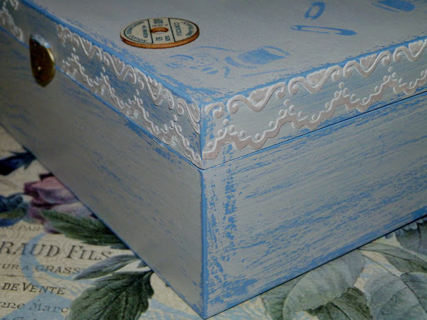 Una caja de madera decorada y convertida en un sencillo costurero.