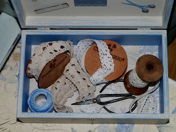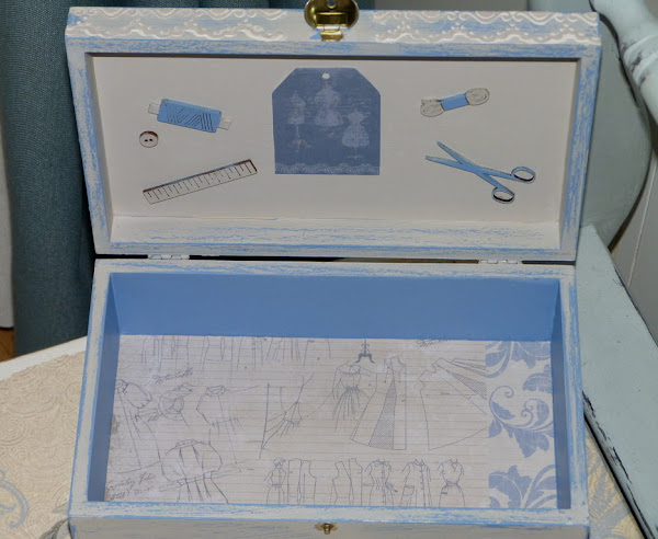 Y el interior de la caja de madera decorado con papel de scrap de patrones de costura en los mismos tonos.