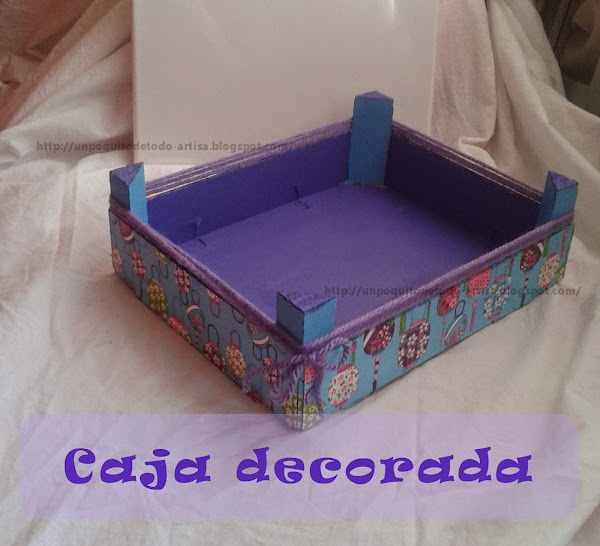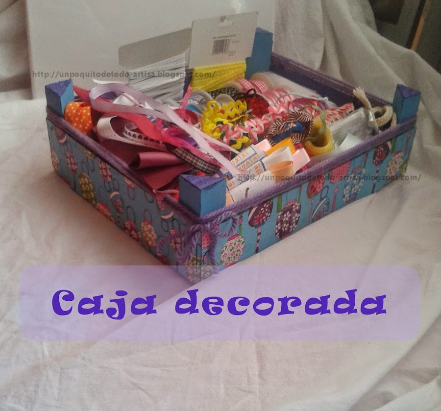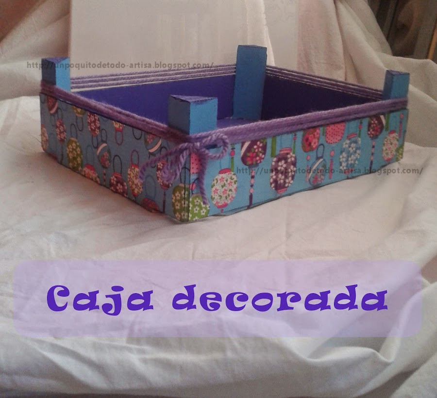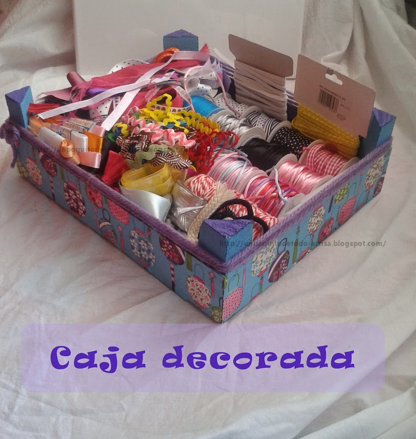 Esta que está decorada con una servilleta con farolillos chinos, le añadí lana por alrededor para que no se salgan las cintas, gomas y demás que tengo guardadas en ella.