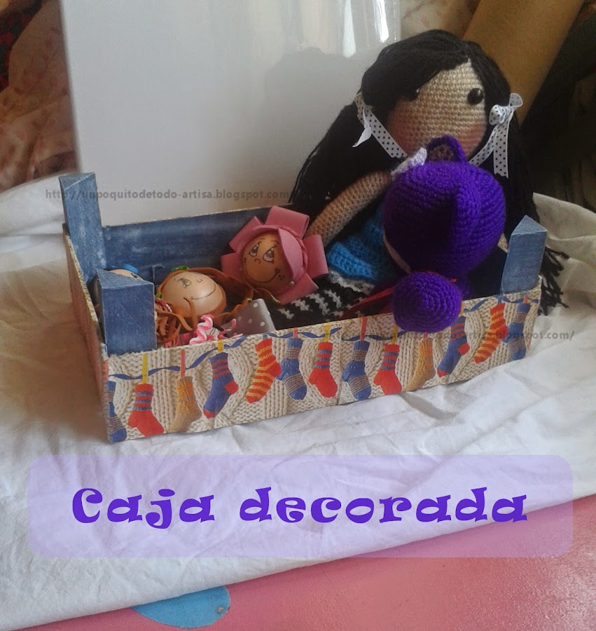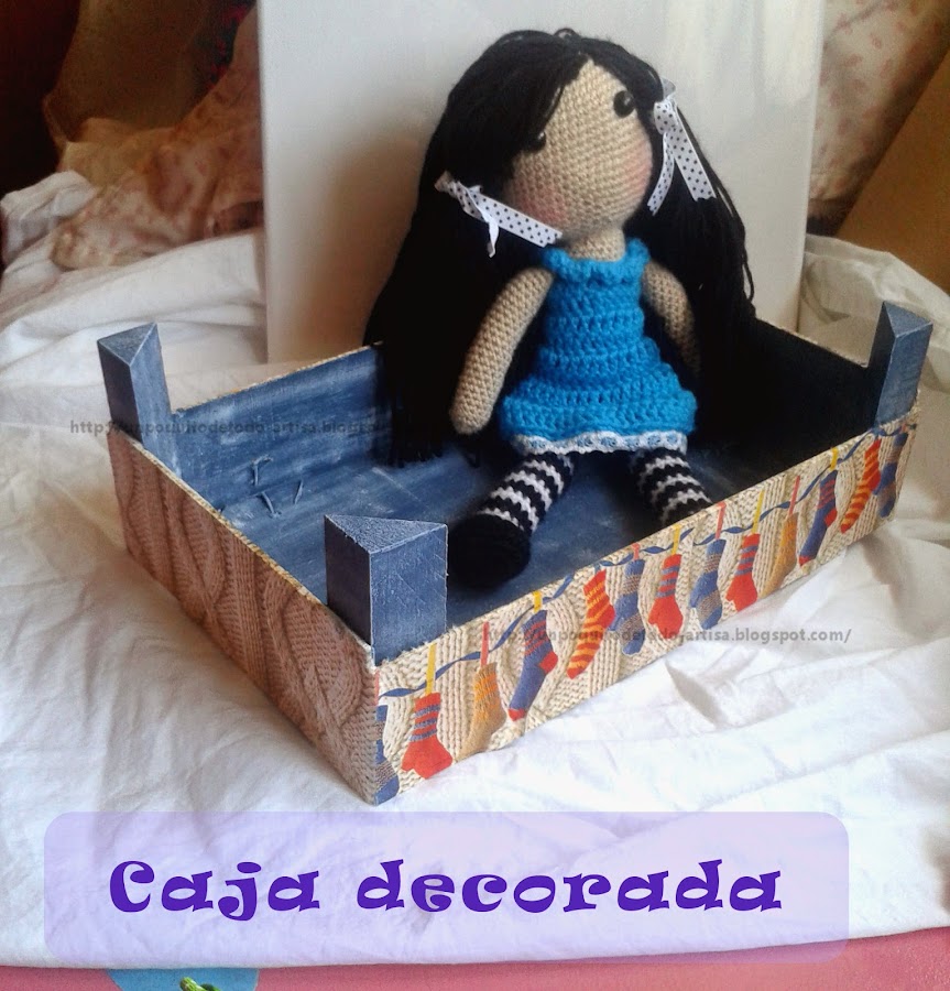 Esta decorada con una servilleta que se asemeja a lana y calcetines, no sé muy bien para que usarla, de momento le pongo los trabajos de crochet que lleve a medias.