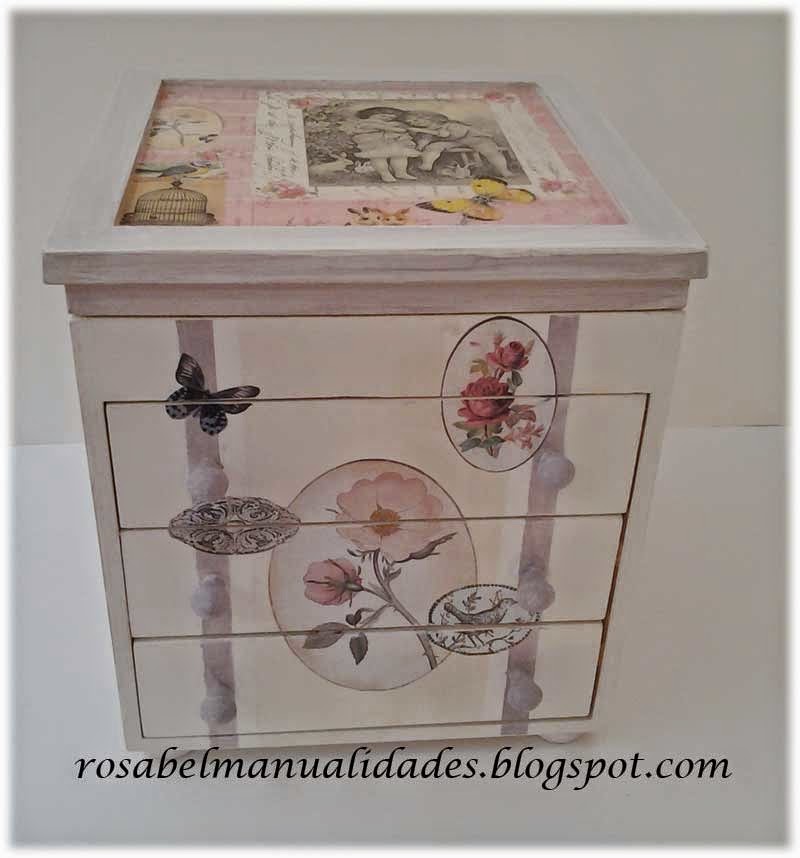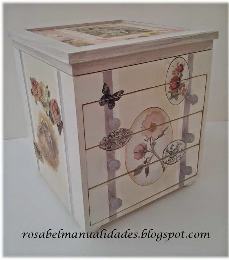 Una caja pintada en tonos suaves y decorada con un decoupage