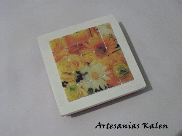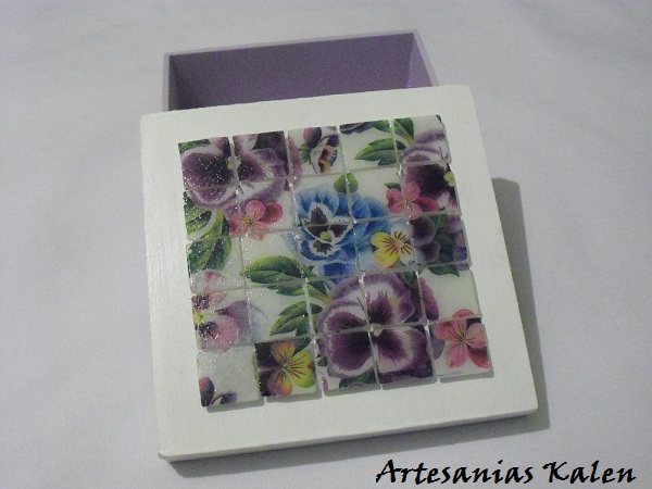 Realice estas cajas decoradas con venecitas (las que se utilizan para mosaiquismo) a las cuales les aplique motivos de servilletas y luego las pegue en las tapas formando un falso mosaiquismo (ya que no se les coloca la pastina en la juntas).