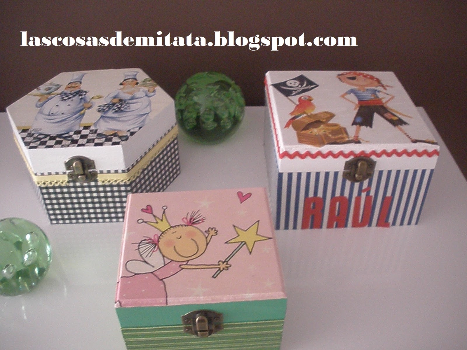 Este pack de tres cajas están ahora mismo volando rumbo a Las Palmas. En esta ocasión he mezclado servilletas y papel para decorarlas con la técnica Decoupage. Se trata de dos cajas infantiles, una para Raúl y otra para Nayara que pondrán en la repisa de su habitación, y la tercera será para la encimera de la cocina.