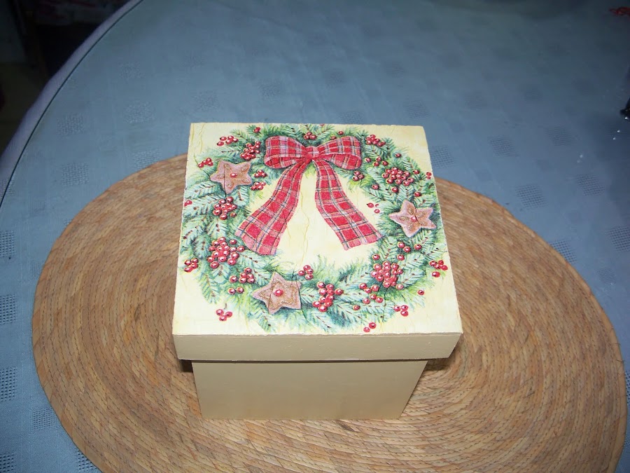 Por acá encontramos un porta-cubiertos de maderalo pinte por fuera de color marfil con pintura acrílica yagregué detalles en decoupage, ya preparándonos parael bazar navideño.