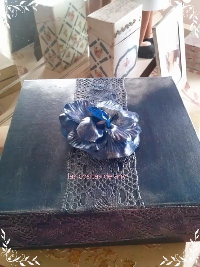 que partido les sacamos a estas cajas...con esta tecnica quedan preciosas..toda pintada en azul fuerte,puntillas y una flor normal de plastico,puntillas,y despues con plata,y voila..me encantan como q ...