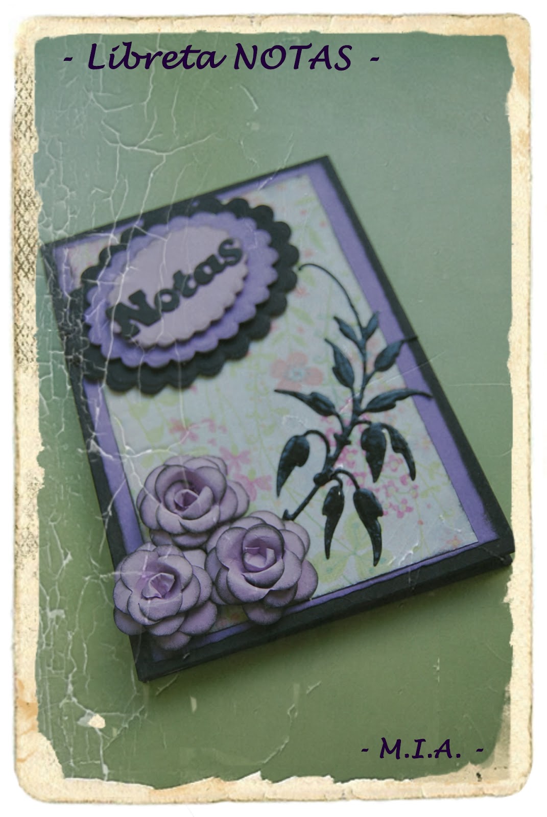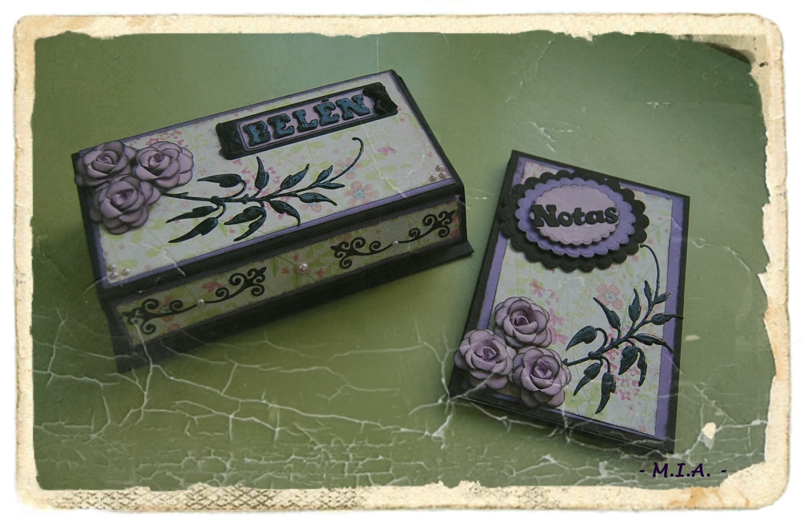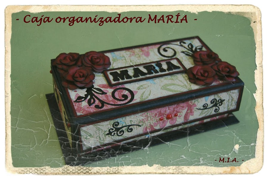 Para María en tonos burdeos... Papel del taco-papeles, arabescos con Glossy Acent así como su nombre troquelado varias veces y pegados entre sí para dar volumen. Unas rosas caseras y unas pelitas a tono completan la decoración...