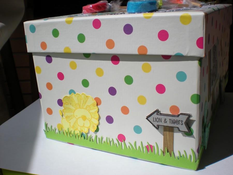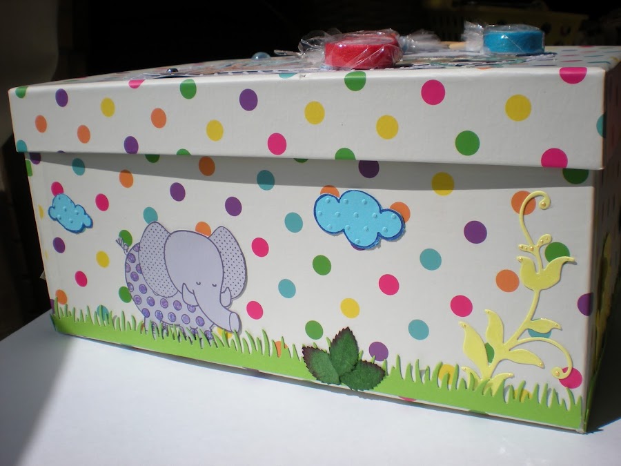 El elefante esta decorado con glitter morado, y la planta amarilla esta decorada con glossy acent y liquid pearl, el césped que aparece por toda la caja esta realizado con die namics, las nubes estan embosadas con la folder emboss de dots.