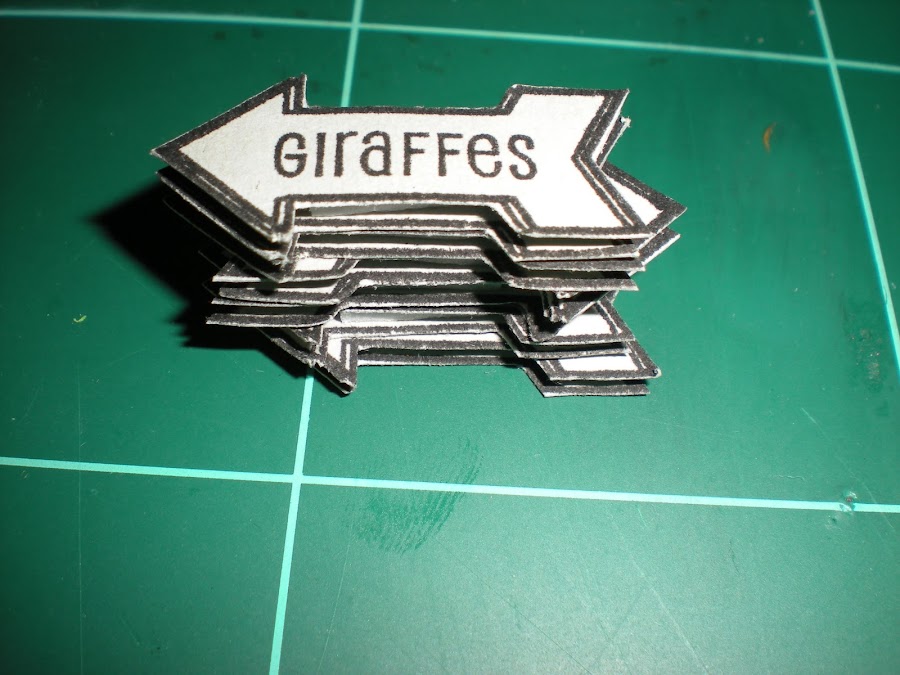 La jirafa esta decorada con liquid pearls , la estructura del cartel esta por un lado el poste estampado con un sello efecto madera y la parte superior con un sello craquelado, la serpiente esta en relieve para lo cual use cinta 3D y esta decorada con glitter de color verde, la flor que esta al lado de la valla es de madera, y la valla esta realizada con un troquel de martha stewart.