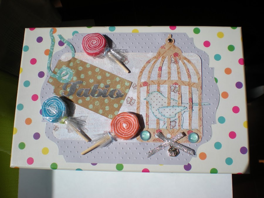 Estas son las tapaderas: tienen un papel de fondo embosado con efecto de dots realizado con una folder e mboss de la big, la forma del contorno del papel esta cortado con un troquel de la big, sobre puesto a este va una lámina de papel con los cantos redodeados, el tag , así como la jaula y el pajarito están elaborados con troqueles de la big, las piruletas las realice con fieltro de colores os dejo el post del tuto que las hice en agosto, el nombre esta recortado con la craft en cartulina efecto espejo, los pebbles son caseros con papel de scrap en tono azul y pegado con glossy acent, un lacito al que va cosido un charm de plata cuyo motivo es el típico cubo infantil con un ABC, la jaula en la parte superior esta rematada por un brad metálico plateado .