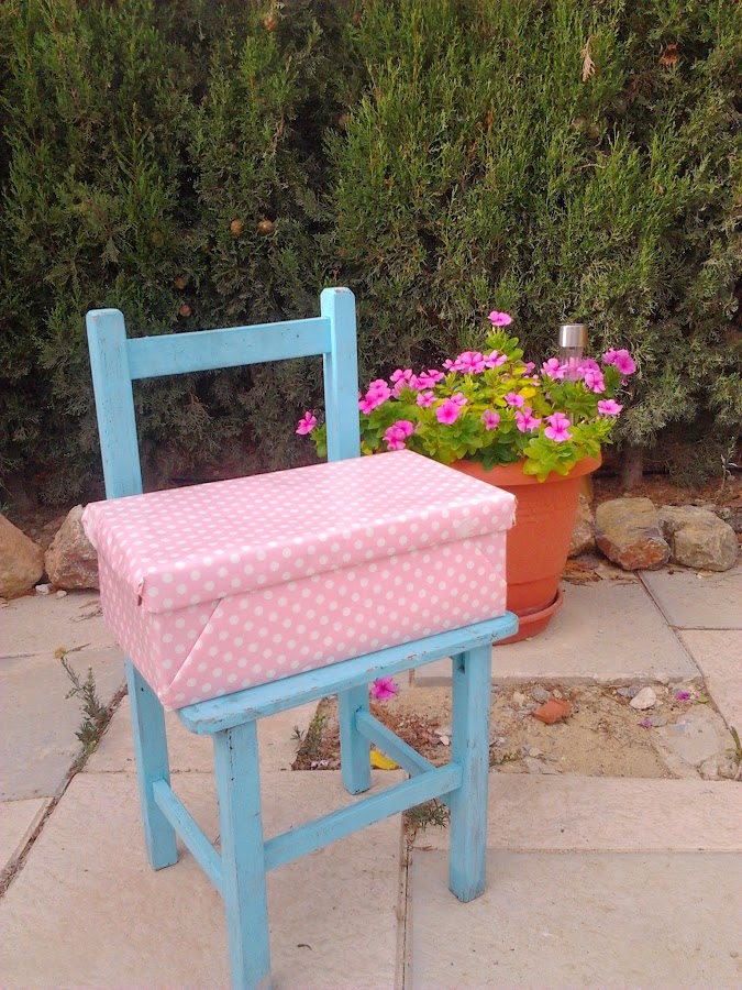 Esta la bonita en rosa y lunares, la hizo mi hija. Con una caja de zapatos y papel de regalo.