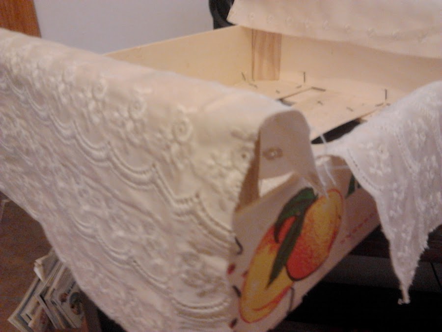 Esta caja es de esas de la fruta. Lo que hice fue forrarla con tela. Se coge la medida de la caja y se cose. Yo la uso para poner las telas.