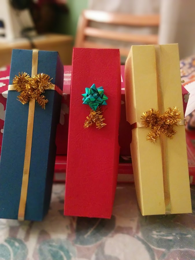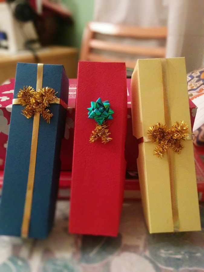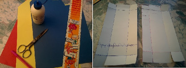 Como os digo llegó el día de Reyes y me encontré que los Magos habían dejado tres bolígrafos solidarios para los hombres de la casa pero parece ser que no les había dado tiempo de envolverlos ni de ponerles ninguna cajita y es que la carta la entregué a sus majestades un poco tarde. Así que decidí hacerles unas para meterlos. Los materiales son muy sencillos: cartulinas de colores, pegamento, tijeras, regla, bolígrafo o lápiz para marcar y lazos para decorar.