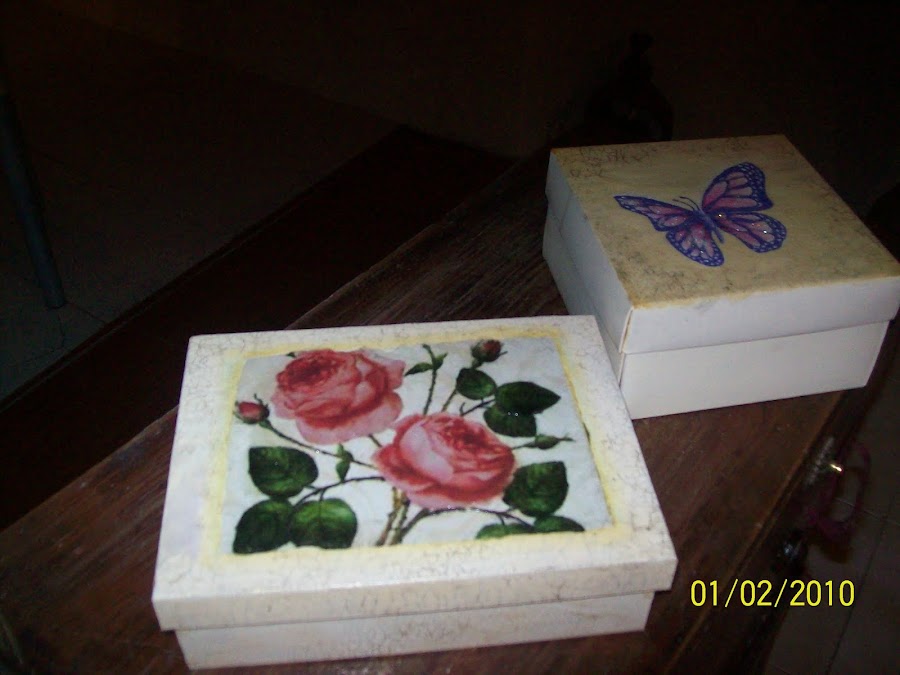 La caja con rosas tiene un decoupage y craquelado y es de fibrofácil o mdf.
