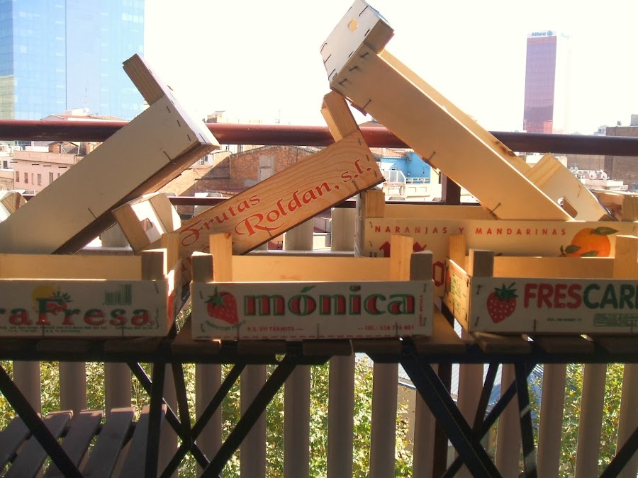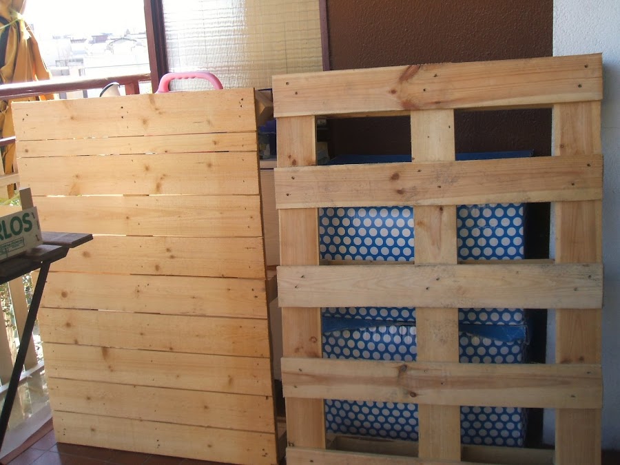 Tengo terraza de mi casa lleva de palets y cajas de fruta. Estoy trabajando con el reciclaje de este material y hacer estanterías.