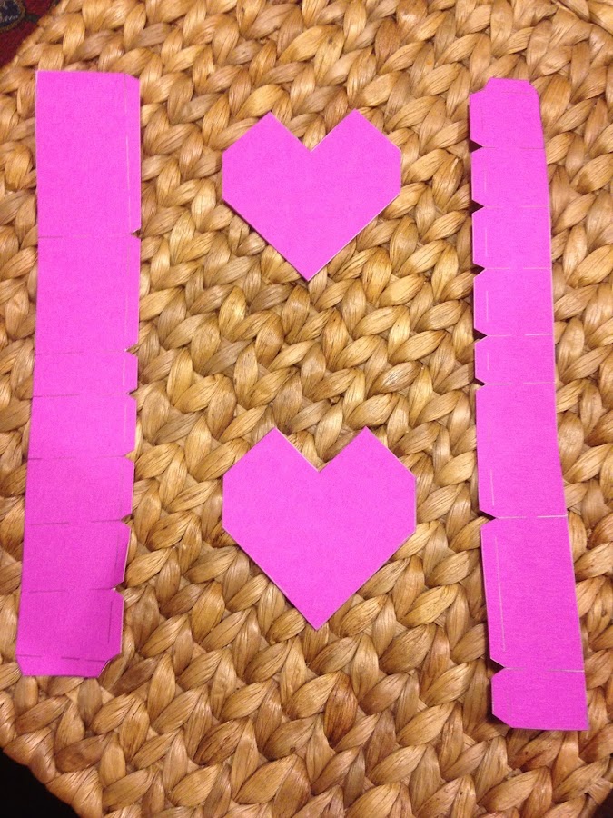 Dobla los pliegues hacia dentro, ponle pegamento y pegalos en el borde del corazón, hasta que las puntas de las tiras se unan y pegalas, has lo mismo con el otro corazón y su tira.