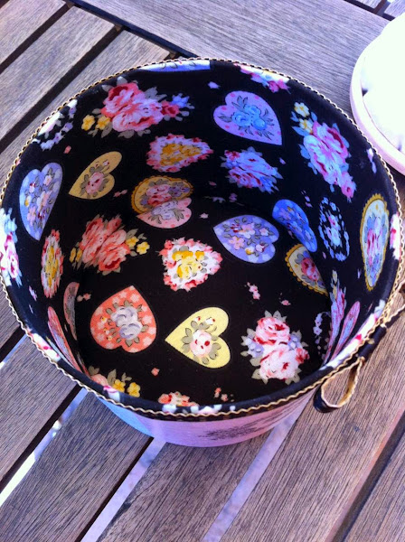 El interior lo forré con una tela alegre, pero con un puntito romántico para que cuadrara bien con el estilo del exterior. Al fondo le puse guata para que se quedara más abullonadito, que así está más agradable. Manías de una...
