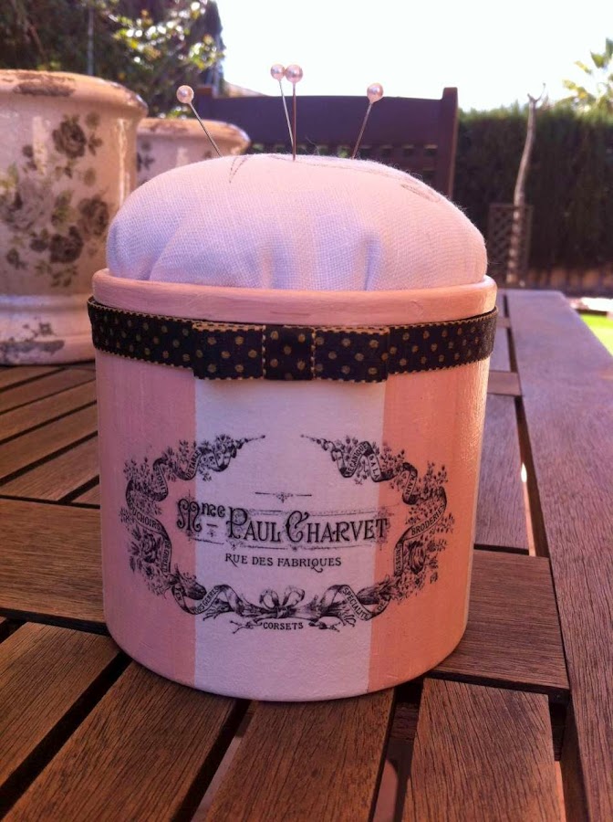 Era una caja de tabaco de liar, me la dió mi amiga Mª José (gracias guapa!). Lo pinté con lo que tenía más a mano, puesto que era un experimento para probar con las transferencias, así que me apañé con esmalte acrílico blanco y una mezcla que hice con pinturas acrílicas de CASA, pretendía un color beige pero me salió este rosa que tampoco me disgustó. La decoración la hice con la técnica de la transferencia, con el método Mod Podge. Bueno, en realidad usé un producto sucedáneo, tengo que probar con esta marca a ver qué resultados da. Elegí este motivo vintage francés que me encanta, y teniendo en cuenta que iba a ser una cajita de costura, qué mejor!