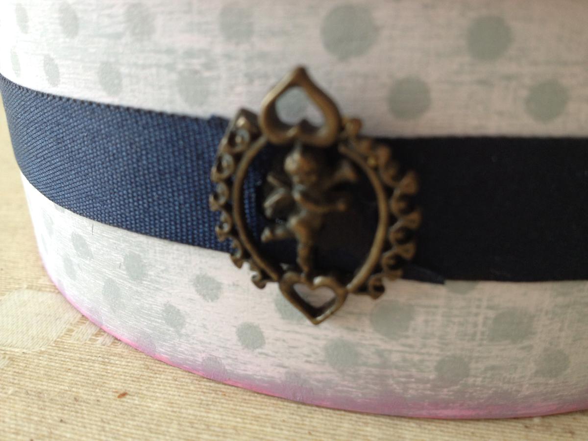 Una cinta de raso azul marino y el angelito para decorar.